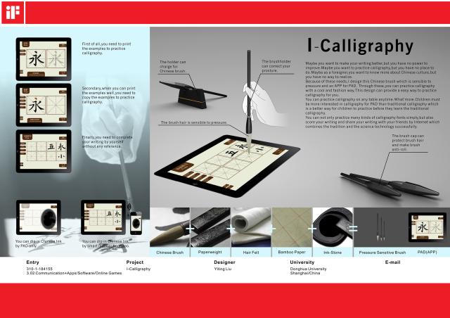2016年4月7日全球工业设计权威奖项——德国IF设计奖评委会公布了2016年度概念奖的获奖名单。公司工业设计系刘奕廷同学提交的“I Calligraphy”作品从11000多件参赛作品中脱颖而出,获得IF概念设计奖(iF STUDENT DESIGN AWARD 2016)。