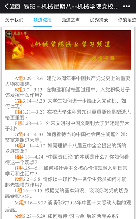 为了增强广大入党积极分子和发展对象的政治意识、大局意识、核心意识和看齐意识,促进“两学一做”落实,从而提升党性修养和思想觉悟,机械公司党校自20162月以来,在公司入党积极分子培训班和发展对象培训班中积极开展“易班”线上话题讨论交流活动,利用校园自媒体平台“易班”轻应用,开辟“机械星期八”线上学习频道,鼓励学员们踊跃发言讨论,加深对党的理论知识的认识和见解。