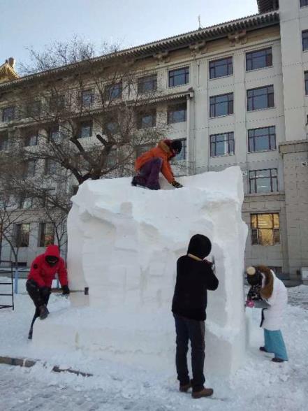 本届雪雕大赛共收到来自中国、英国、泰国、俄罗斯、丹麦等7个国家和地区的95所高校提交的183件参赛作品,最终55支代表队入围决赛。今年是公司第四次组织员工参加雪雕大赛并成功入围决赛。早在去年10月大赛启动之初,在公司团委和机械公司的大力支持下,公司工业设计专业刘志辉老师、姜鑫玉老师便开始积极组织员工报名参赛。在获悉作品入围后,参赛队长满达呼以及队员张凇、韩云斐、陈昱志四位同学,在作品指导老师姜鑫玉老师、赛前模型制作指导老师王思萍老师的指导下积极备赛,在短短2周内制作了比例模型并提前预演整个制作过程。在正式比赛过程中,参赛师生克服了户外零下20多度的寒冷,在缺少雪雕实战经验的基础上,凭借毅力、体力和团队合作最终圆满完成了雪雕作品《我家的中国梦》。该作品以改革开放40周年为时代背景,在作品中展现了一个家庭在中国共产党的领导下始终抱着坚定的信念走在富强的道路上。抽象人物的手臂向上托举五角星象征着我们始终坚持党的领导。人像背后的四排旗帜代表着改革开放40年。