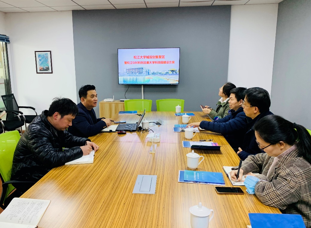 吴世平在调研会上分享了关于松江大学城双创集聚区与松江大学城科技园的建设方案,基于松江区“十四五”规划与2021年政府工作报告中关于松江大学城的定位,提出了双方共建“创新孵化园”的工作设想。