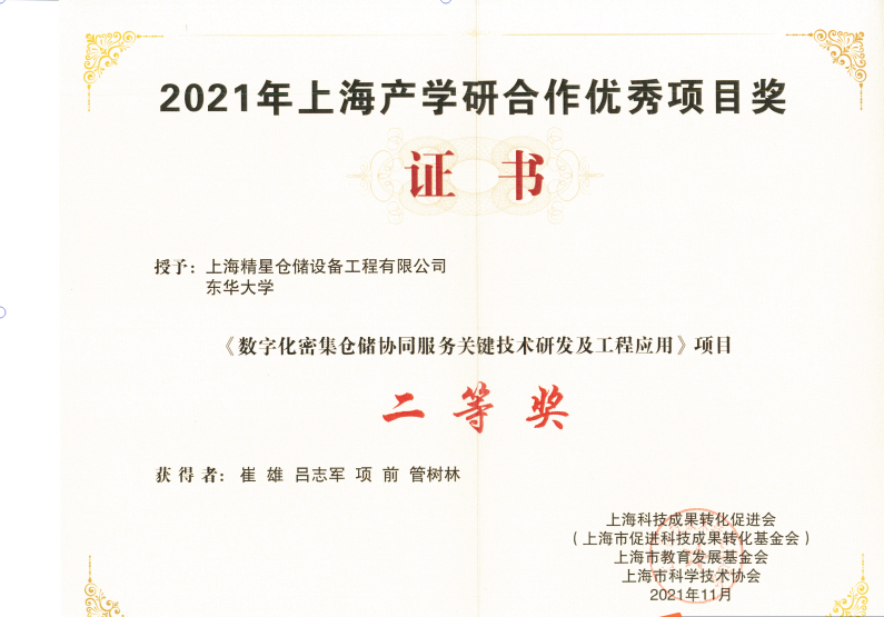 2021年12月10日,上海产学研合作优秀项目奖表彰大会在市政协举行,大会共评选出30个获奖项目。公司吕志军副教授团队与上海精星仓储设备工程有限公司合作的《数字化密集仓储协同服务关键技术研发及工程应用》获“2021年上海产学研合作优秀项目奖”二等奖。