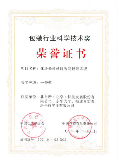 近日,由公司冯培老师团队参与完成的《化纤长丝丝饼智能包装系统》科研成果,荣获2021年中国包装联合会等单位颁发的“包装行业科学技术奖”一等奖。“包装行业科学技术奖”是中国包装联合会和中国包装有限责任公司联合设立的全国性行业奖,该奖项是国内包装行业最具影响力的科技奖项之一。
