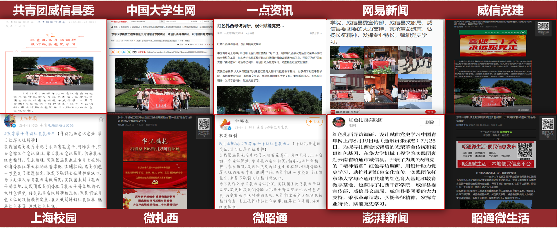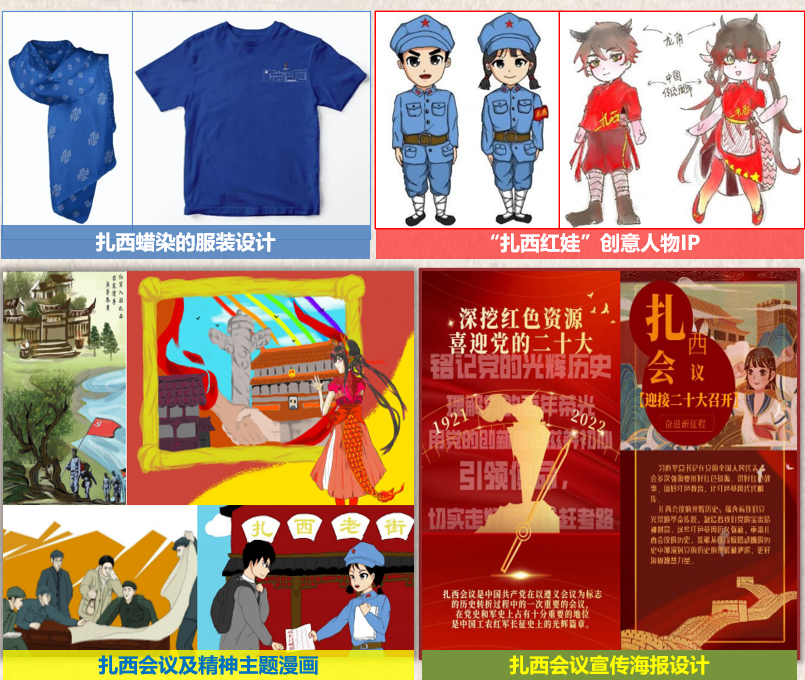 在此次实践期间,共计收到 2070份有效问卷,通过与考察纪实、访谈记录相结合,形成5份文字资料,站在不同的角度,认真分析扎西会议对威信建设的社会效益和影响。实践团循着红军的足迹,编撰《扎西红色调研记》,将红色故事、革命遗址付诸图文表达。团队以扎西红色文化为主体、融合多元文化,设计周边产品图样5类共23幅,文创20类共82款产品。并与当地各部门对接,成功将部分产品实物落地。其中团队成员设计的四款文创产品均已申请版权认证。团队制作云游扎西系列视频、红色文旅宣传视频等共计16个视频,在微博、小红书等网络媒体上累计浏览播放量达6万次。实践团先后获得环球网、中国老员工网、威信党建等总计28家媒体44篇宣传报道。