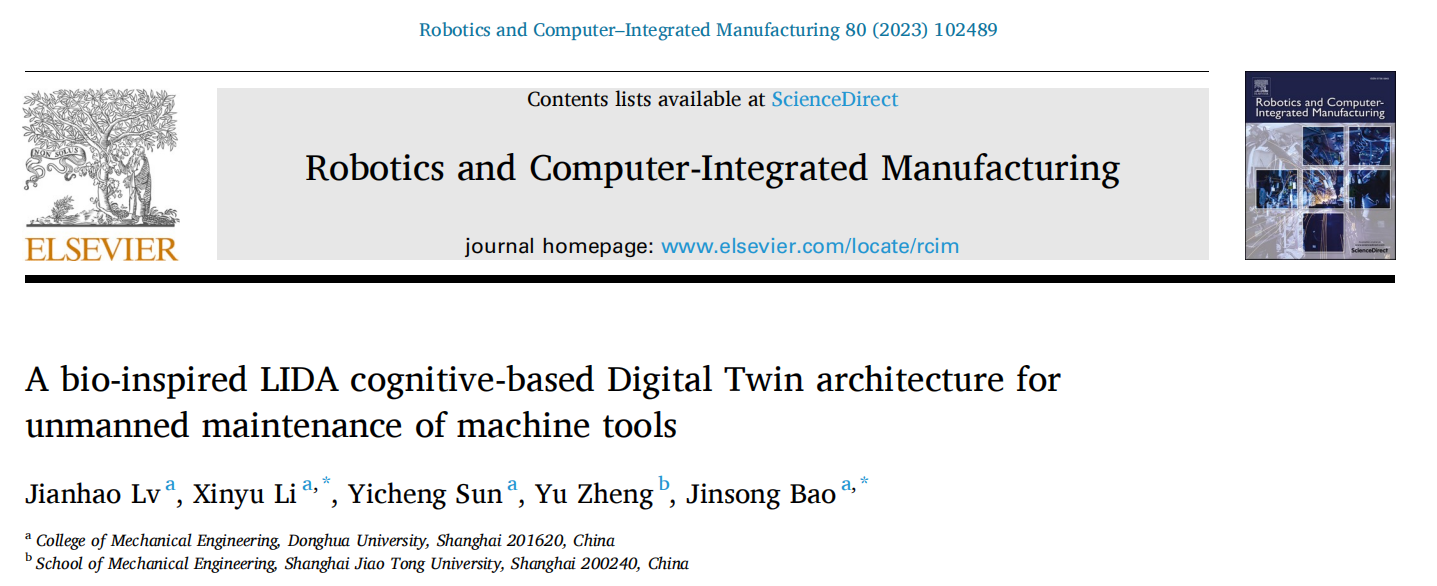 近日,公司William希尔官网入口智能制造团队在数字孪生认知智能制造方面取得新进展,这一成果以“A bio-inspired LIDA cognitive-based Digital Twin architecture for unmanned maintenance of machine tools(一种用于无人机床维护的LIDA认知仿生数字孪生架构)”为题发表于国际制造知名学术期刊《ROBOTICS AND COMPUTER-INTEGRATED MANUFACTURING》(中科院一区,影响因子10.103)。论文以William希尔官网入口为第一单位,李心雨特聘研究员和鲍劲松教授为共同通讯作者,所指导的吕健豪博士生为第一作者。