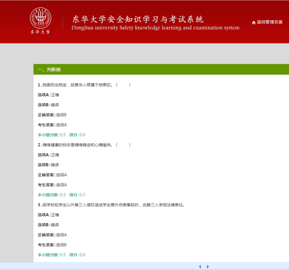 6、可以通过点击“自测成绩查询”了解自己的自测成绩,并且可以通过点击所得分数,查看本次自测试卷和正确答案。