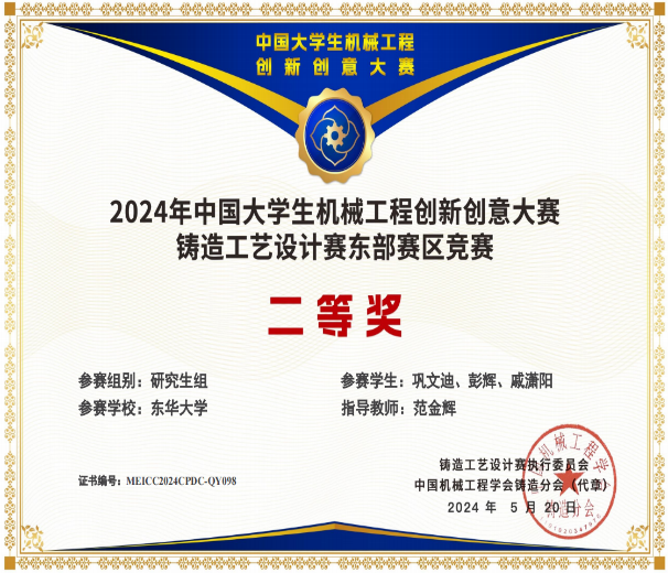 本次赛事共有132所参赛院校的1715份作品报名参赛,经校内选拔赛,最终819份作品提交至执委会参加区域赛,其中本科生组作品715份,硕士研究生组作品104份。铸造工艺设计赛全国总决赛初评评选会议于2024530日在辽宁省沈阳市召开,会议期间产生了本届赛事的三等奖(部分)及入围全国总决赛终评的作品名单。公司研究生组的巩文迪、彭辉和戚潇阳同学获得了全国三等奖的好成绩,并且本科生组的骆怡彤和蒙娅同学与研究生组的尚坡、王鹭和程健森同学都进入到了决赛。后续铸造工艺设计赛总决赛终评会议将在78日前后举行,将与全国优秀院校角逐名次。
