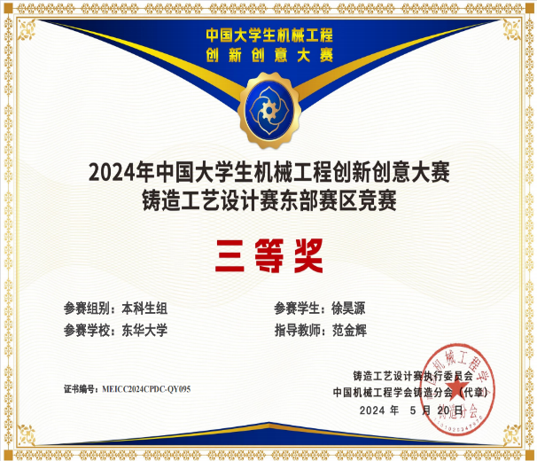 公司员工荣获机械工程创新创意大赛铸造工艺设计赛区域赛一等奖