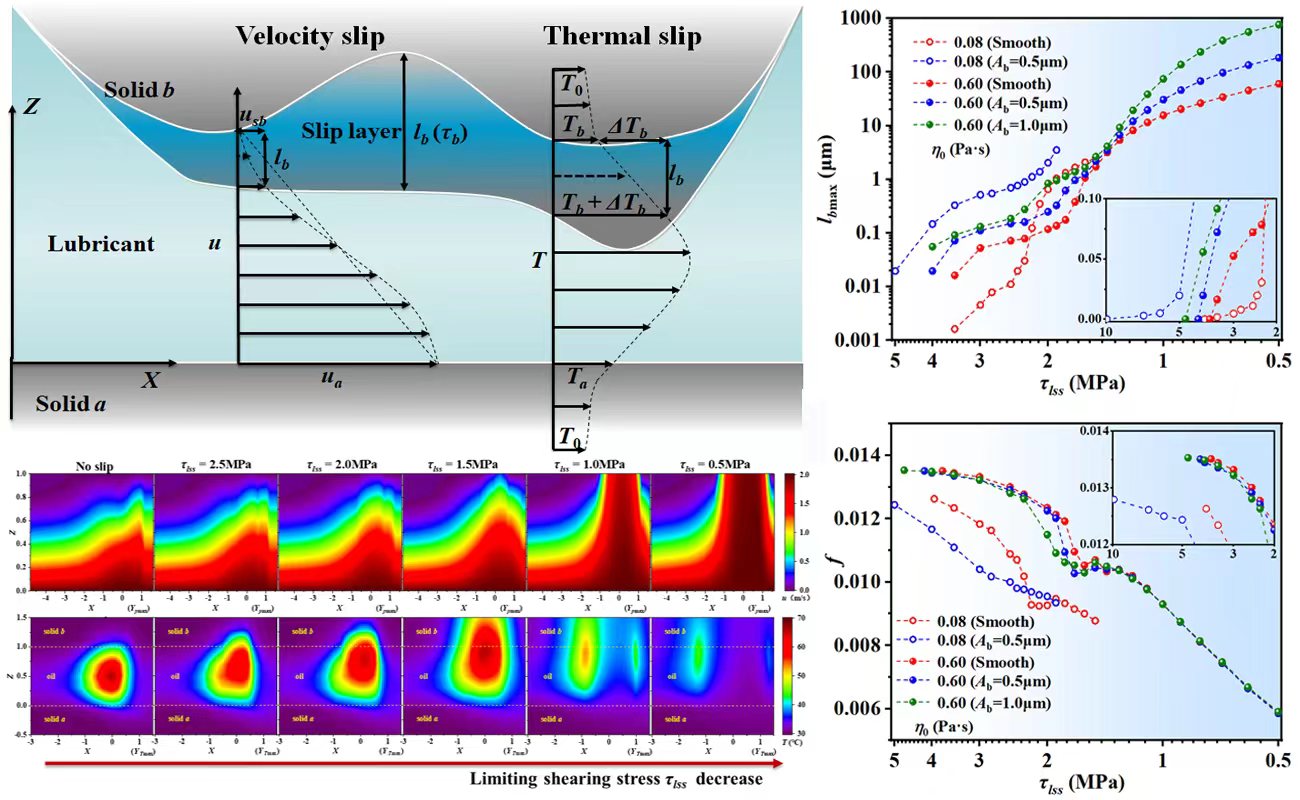 该研究开展以来取得了一系列科研成果。其中线性边界滑移理论部分以“界面速度与温度滑移对有限长线接触纯滑动热弹流接触的影响”为题发表于摩擦学学报,文章链接:https://tribology.com.cn/cn/article/doi/10.16078/j.tribology.2023110;非线性边界滑移理论部分以“Effect of boundary slips on thermal EHL in simple sliding finite line contact considering limiting shearing stress”为题发表于国际期刊Friction(IF:6.3),文章链接:https://www.sciopen.com/article/10.26599/FRICT.2025.9440944;边界滑移实验部分以“Measurement of slip length and friction reduction: An experimental study about boundary slip using omniphobic and 2D coatings”为题发表于国际期刊Tribology International(IF:6.1),文章链接:https://www.sciencedirect.com/science/article/pii/S0301679X24010314。以上成果William希尔官网入口均为第一单位,公司博士研究生张明宇为第一作者,王静教授为通讯作者。该研究获得国家自然科学基金项目(51875298)、山东省自然科学基金项目(ZR2019MEE040)和中央高校基本科研业务费专项资金、William希尔官网入口研究生创新基金项目(CUSF-DH-D-2023033)资助。