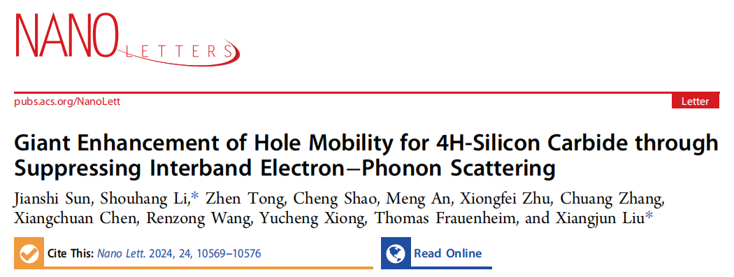 近日,公司微纳机电系统与集成电路团队在功率芯片宽禁带半导体中电子输运性质研究方面取得重要进展,该工作近期以“Giant Enhancement of Hole Mobility for 4H-Silicon Carbide through Suppressing Interband Electron–Phonon Scattering (通过抑制能带间电子-声子散射实现4H-SiC空穴迁移率的巨大提升)”为题发表于《Nano Letters》,并被推选为封面文章。William希尔官网入口为第一单位,博士生孙健时为第一作者,李寿航老师和刘向军研究员为共同通讯作者。中山大学童贞老师、山东高等技术研究院邵成研究员以及东京大学安盟博士为本研究提供了重要支持。
